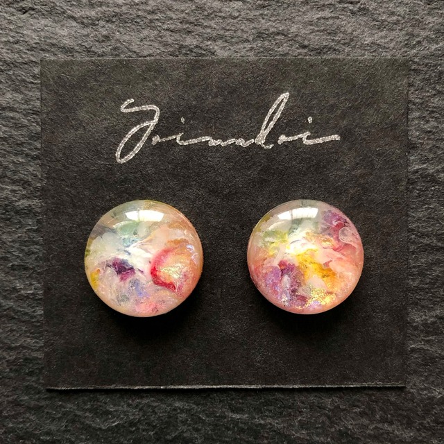 【花の色は -Flower Moon-】20mm耳飾り 新月の夜から次の満月が沈むまでの間に、 新月が満月へ満ちていく間の販売会。 今回は4月17日~5月2日の満月が沈む頃迄です。 2026年5月2日の満月は蠍座の満月です。 そして、5月の満月はフラワームーンと呼ばれます。 5月の満月はフラワームーン。 多くの花が咲く頃であることに由来した呼び名です。 色とりどりの花たちが咲き始め、その美しい花々を月明かりが照らします。 そんな花たちの色を満月に映した作品です。 花の色は かすみにこめて 見せずとも かをだにぬすめ 春の山かぜ (出典 古今和歌集) 春は霞と言います。 一面の霞で花が見えずに、それでも香りだけでもと風に願うように 曇りやすい春の空に朧月を眺められることを願って。 満月の引力は人に様々な影響をもたらしますが、 今宵の月が皆様にとって素敵なものとなりますように✧̇ ------- 素材:レジン サイズ:カボション凡そ20mm 金具:ネジバネ式イヤリング/スタッドピアス(チタン) ※アレルギー非対応です。 ※レジン部分は一つ一つ手作業で制作しております。歪みや気泡が見られる場合がございます事をご了承ください。