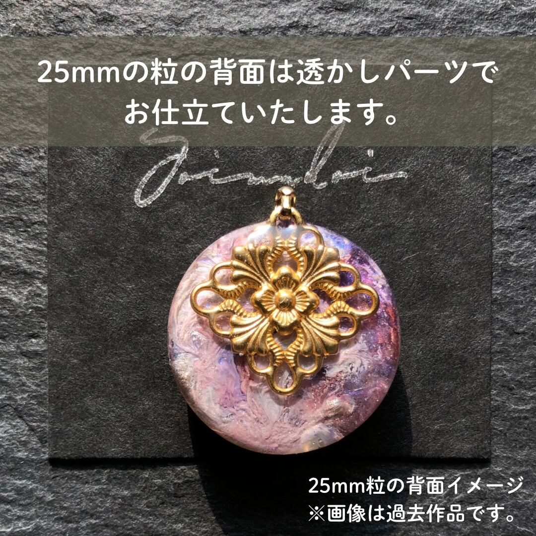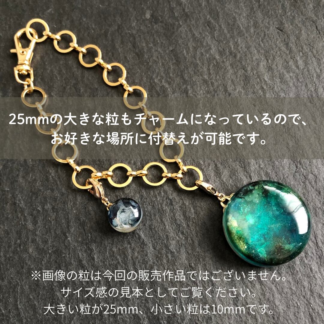バッグチャームの25mm粒と耳飾りの粒で、それぞれお好きなものをお選びいただけます。