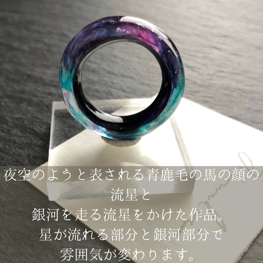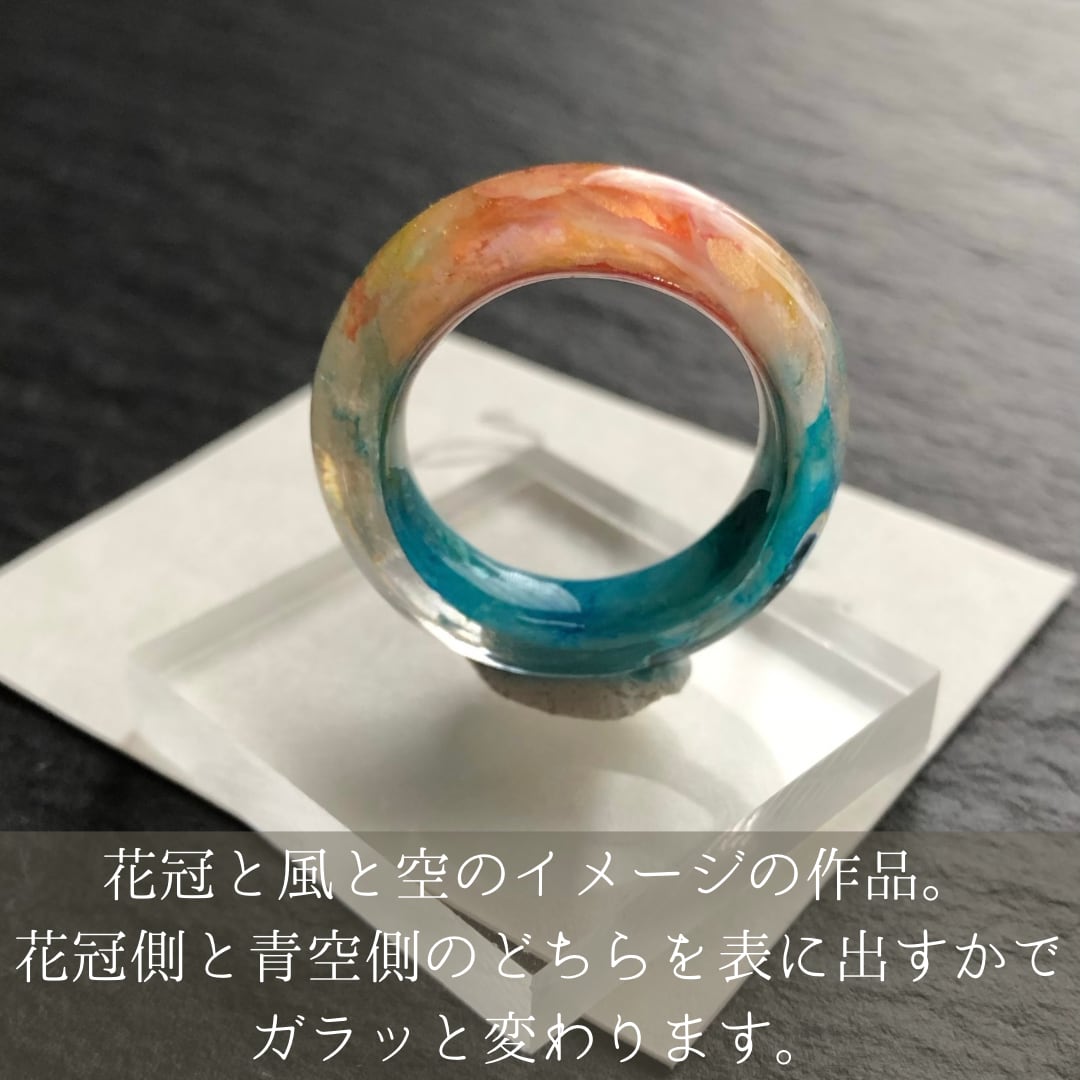 〇丸粒の作品と同じ色を使って制作しますが、平面の丸粒に描くのとリングに描くのとでは制作方法が異なるため、同じ模様にはなりません。あくまで同じ色を使って、雰囲気を寄せて作る作品になる事をご了承ください。
