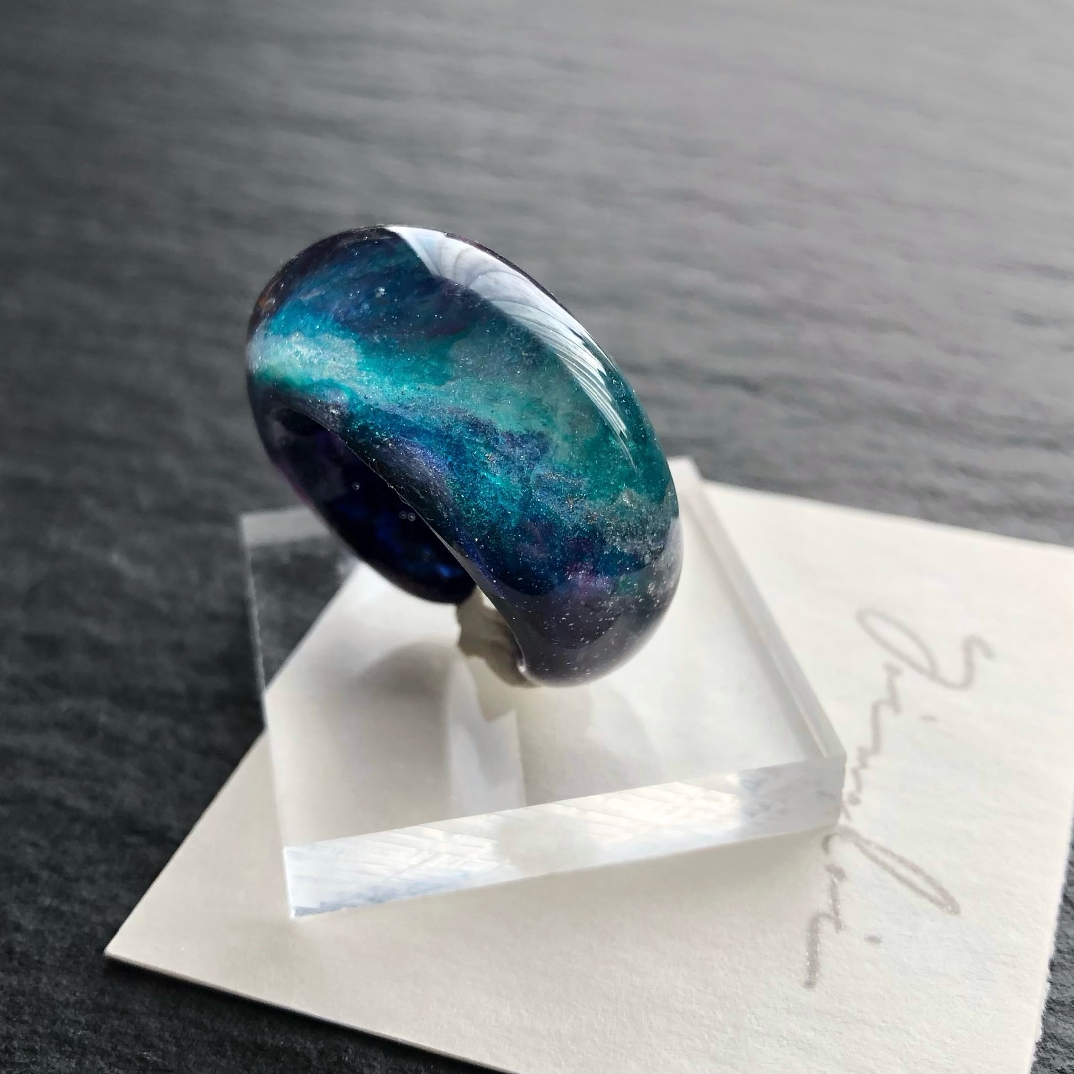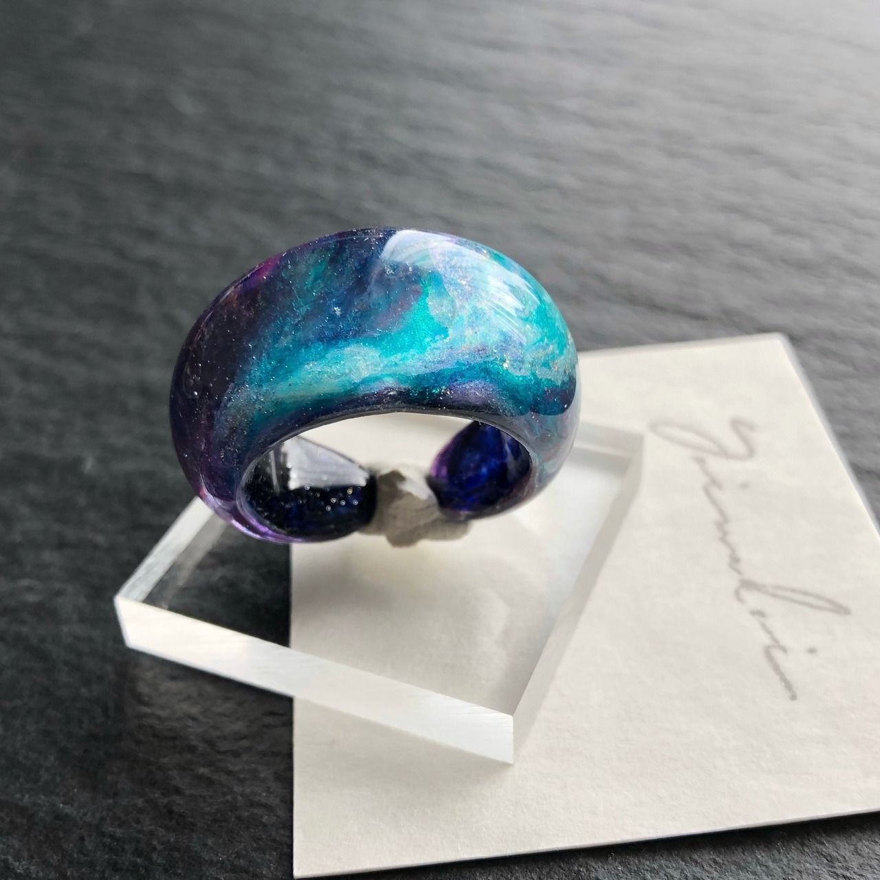 *サイズは日本標準規格で作られたリングゲージで測っておりますが、型を使わずフリーハンドで制作している為に幾分かの誤差が出ます。また、幅広なリングの為ぴったりめのサイズでご注文いただくと少し窮屈に感じる場合がございます。