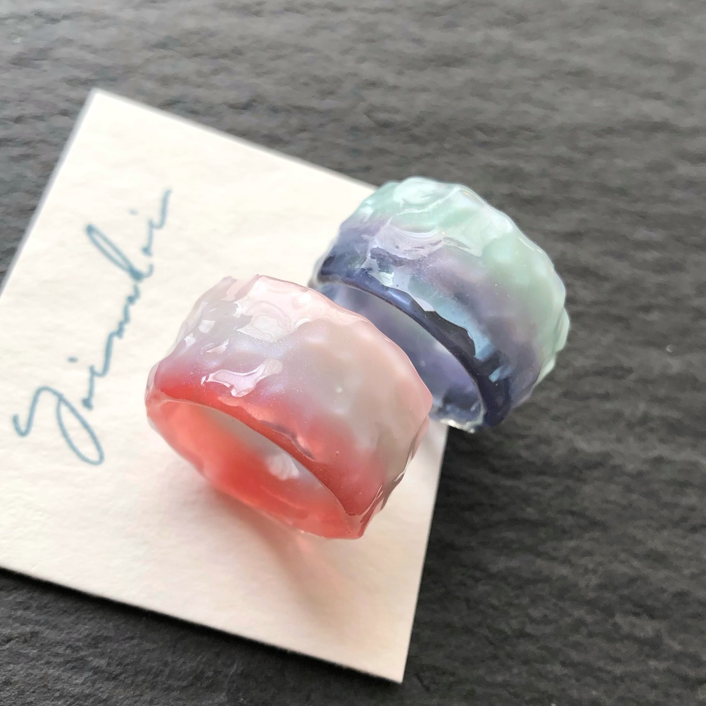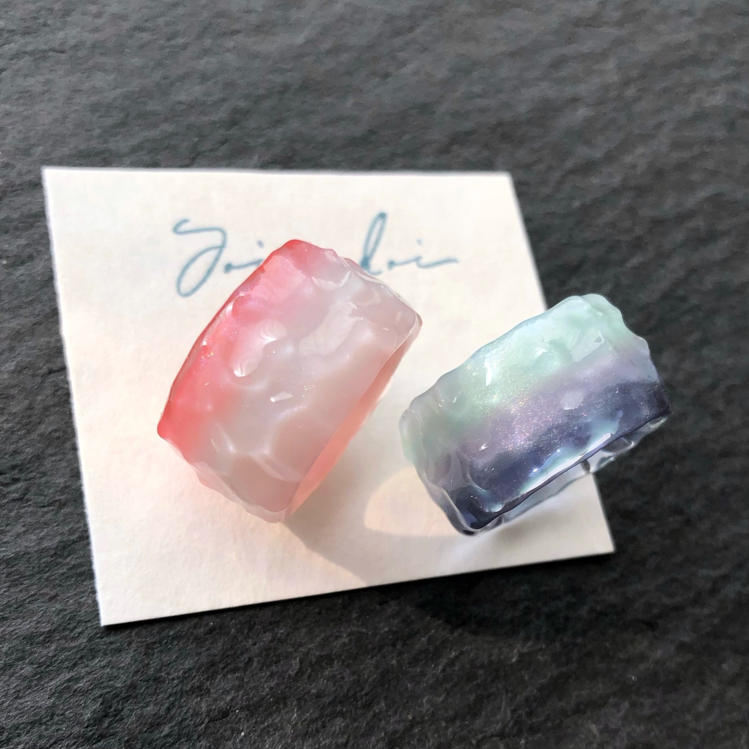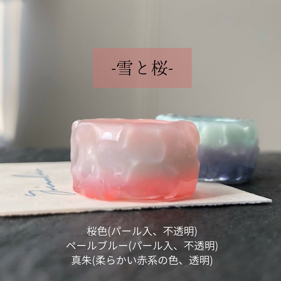 今までは透明な作品として展開してきた揺らぎのリングですが、春と冬を行き来する揺らぎの季節を不透明+パールで表現しております。