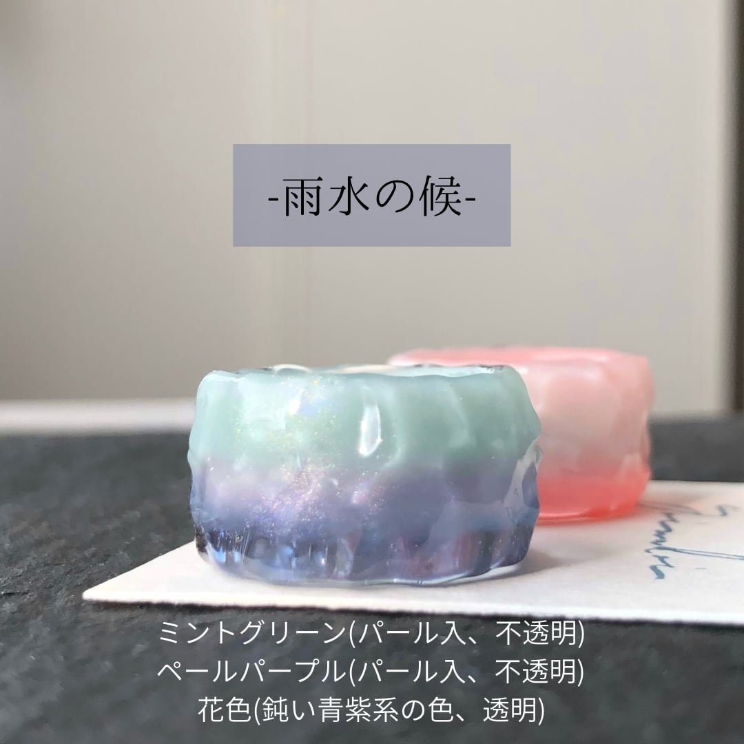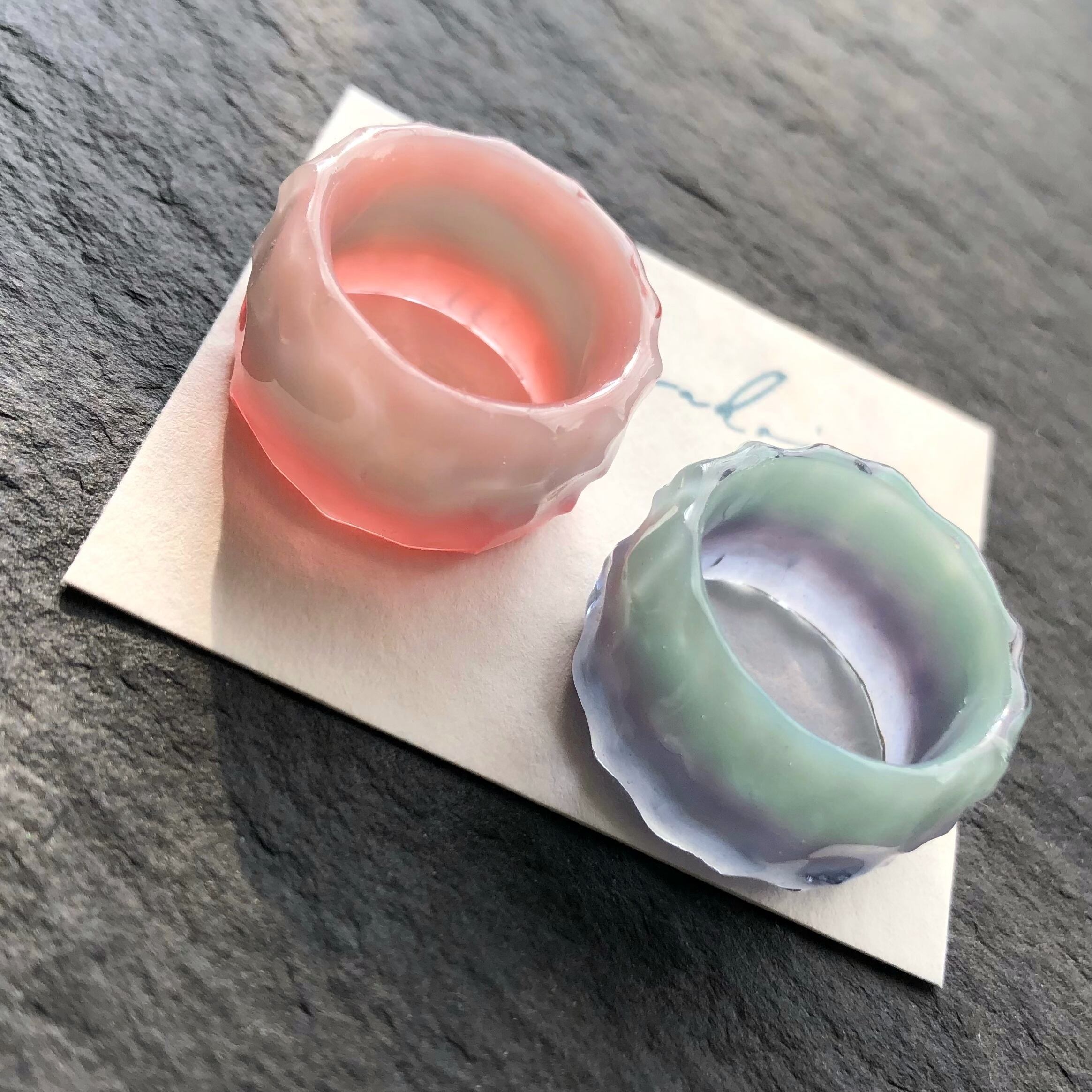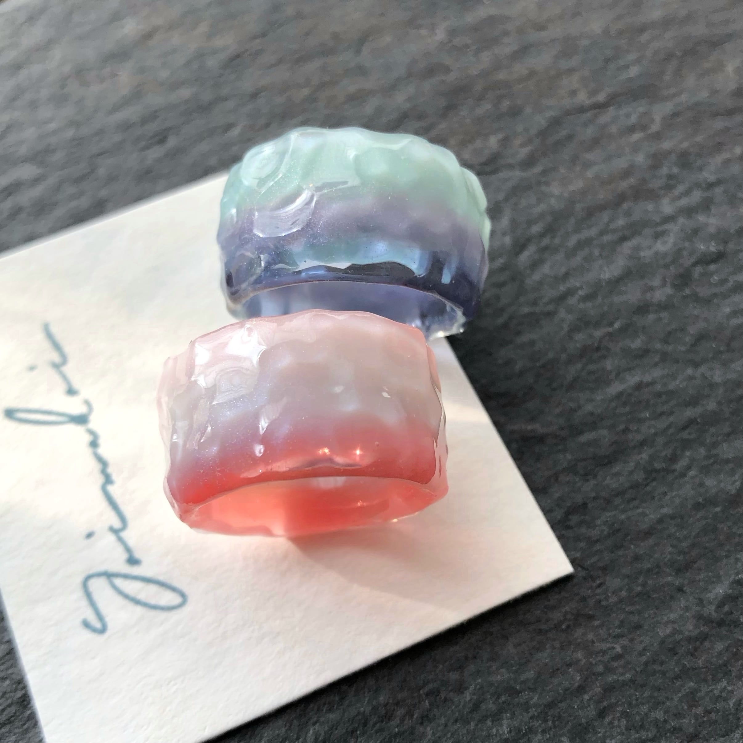 今までは透明な作品として展開してきた揺らぎのリングですが、春と冬を行き来する揺らぎの季節を不透明+パールで表現しております。