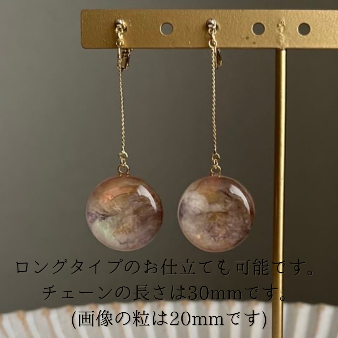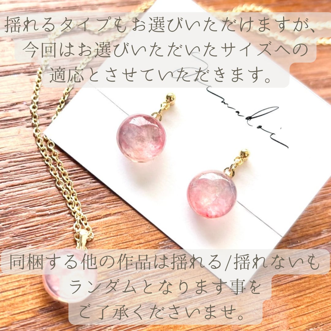 オプションでお選びいただく金具はご自身でお選びいただいた大きさの粒への適応といたします。他のおまかせの作品は揺れる揺れないもおまかせとなります事をご了承ください。