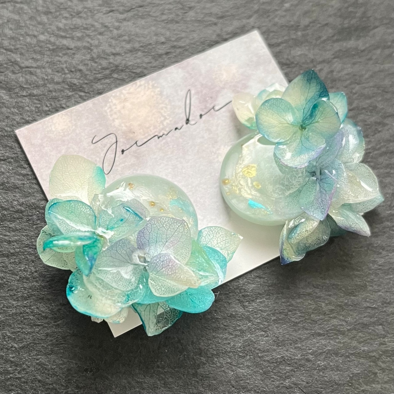 ○簡単には破損しないよう、紫陽花部分もレジンコーティンクを施しています。厚めにコーティングしておりますが無理な力が加わると破損の可能性がございますのでお取り扱いにはご注意ください。